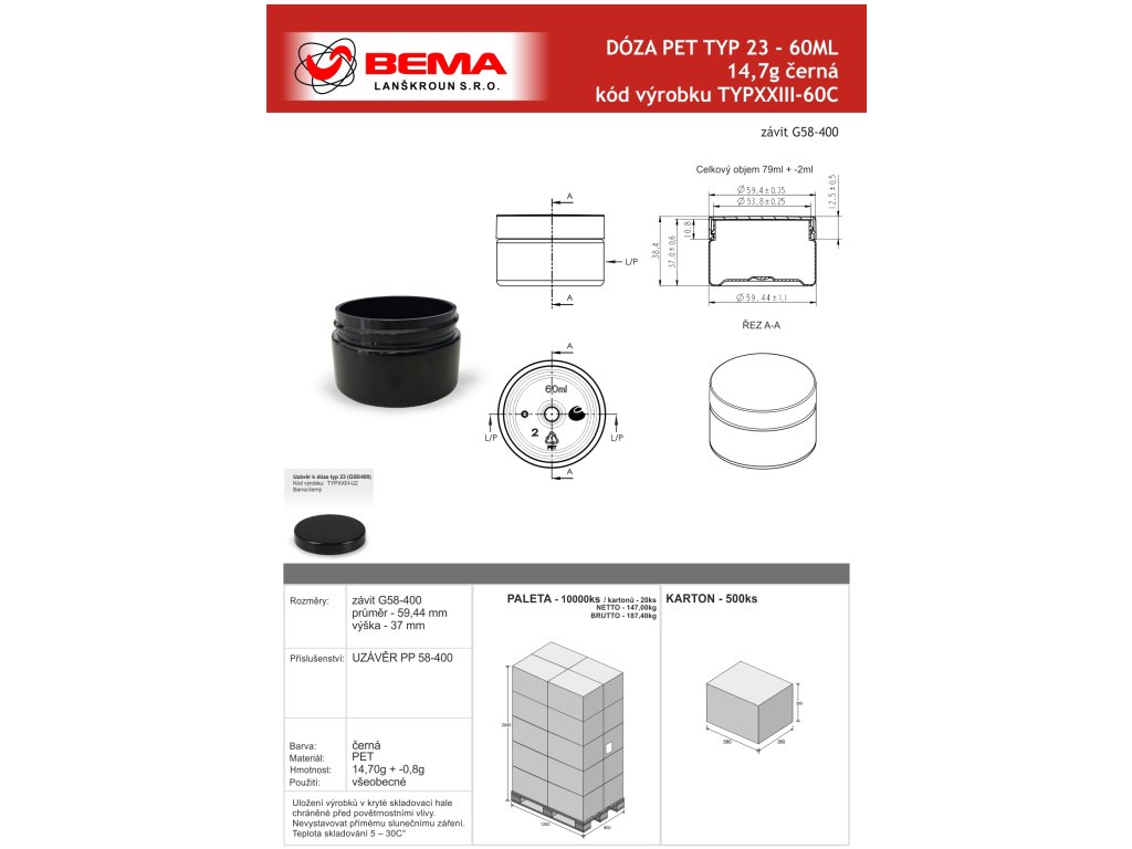 Dóza typ 23 PET 60ml 14,7g černá (G58/400) CENA LAHVE BEZ UZÁVĚRU - uzávěry objednávejte v sekci související zboží