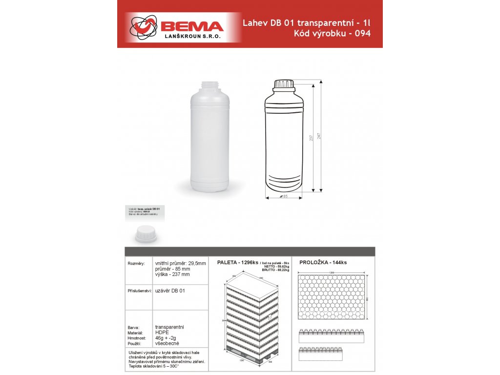 Lahev DB01 1l transparentní CENA LAHVE BEZ UZÁVĚRU - uzávěry objednávejte v sekci související zboží