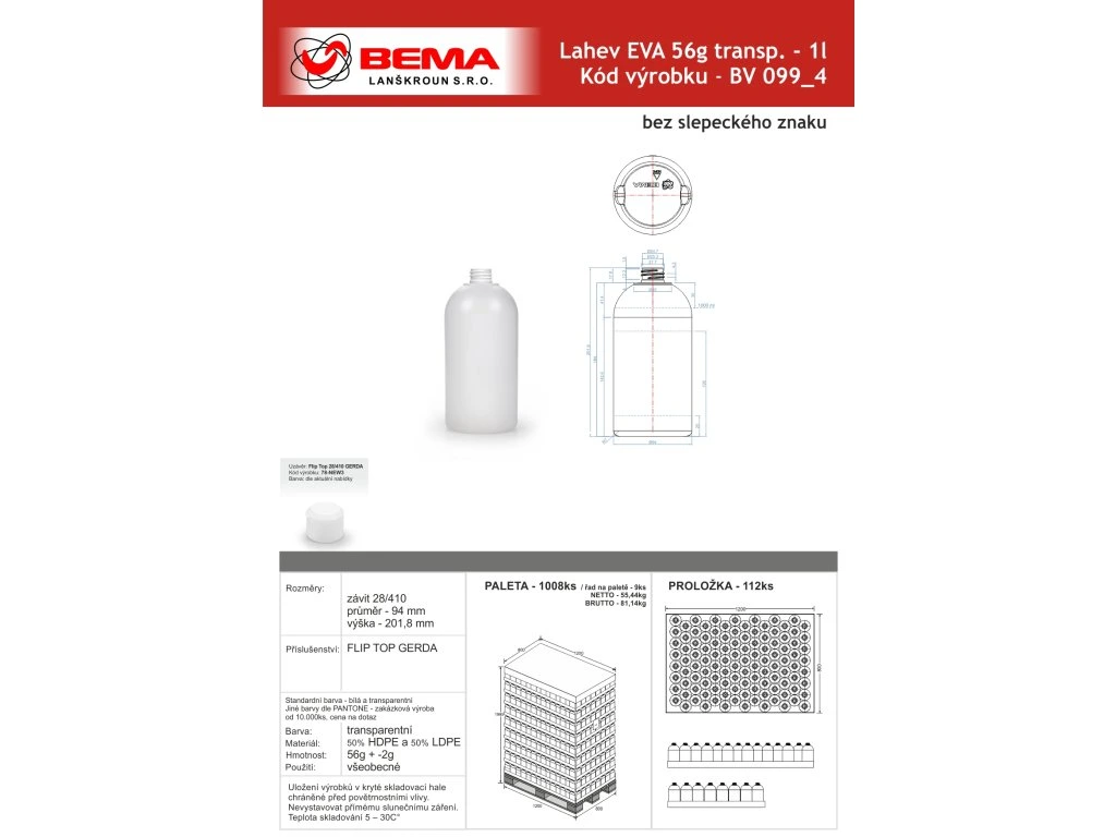 Lahev EVA 1l 56g transparentní 28/410 CENA LAHVE BEZ UZÁVĚRU - uzávěry objednávejte v sekci související zboží
