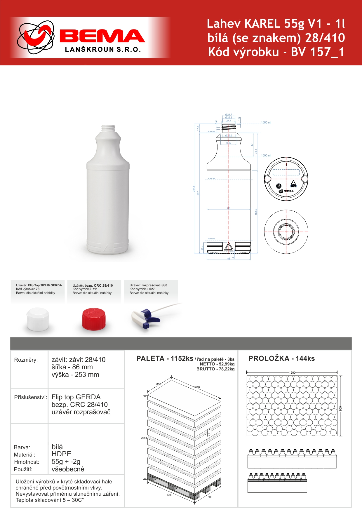 Domů/NAŠE VZORY/LAHVE HDPE A PP/Lahev KAREL 1l 55g bílá (se znakem) / 28/410 Na objednávku / Min. odběr - 11520 ks / CENA LAHVE BEZ UZÁVĚRU - uzávěry objednávejte v sekci související zboží