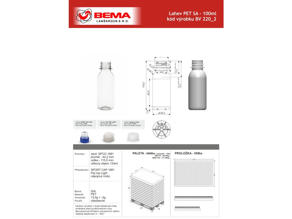 Lahev PET SA 100ml čirá CENA LAHVE BEZ UZÁVĚRU - uzávěry objednávejte v sekci související zboží