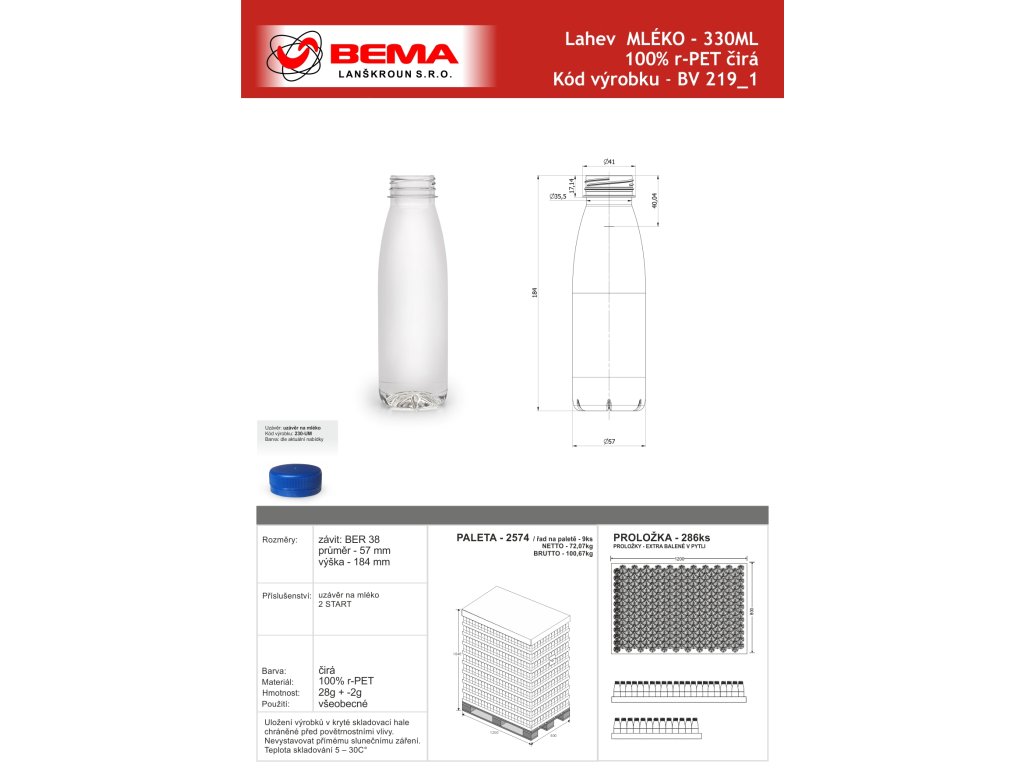 Lahev r-PET MLÉKO 330ml CENA LAHVE BEZ UZÁVĚRU - uzávěry objednávejte v sekci související zboží