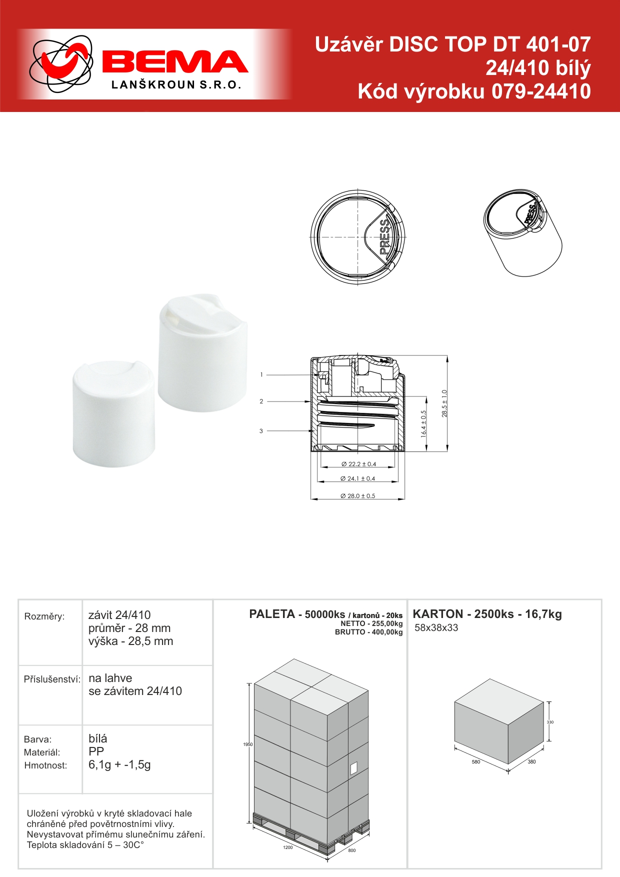 Šroubovací uzávěr Disc Top z odolného polypropylenu (PP) kulatého tvaru se vyznačuje vysokou stabilitou. Je speciálně navržen pro lahve se závitem 24/410 a zajišťuje bezpečné, nepropustné uzavření. Umožňuje snadné otevírání a zavírání, i přesné dávkování.